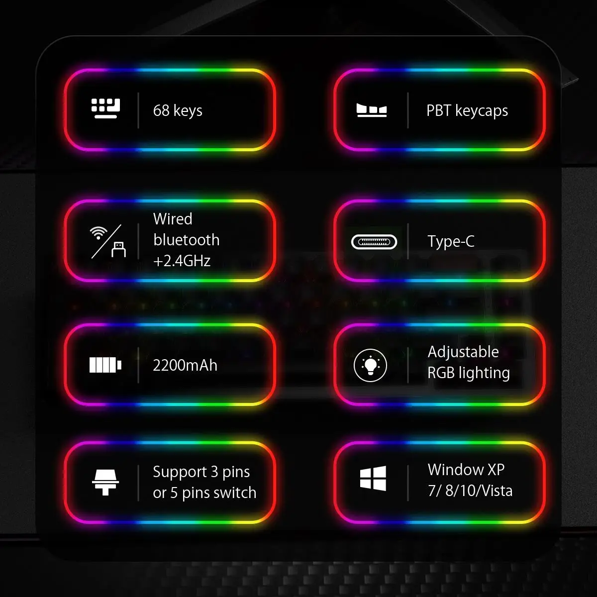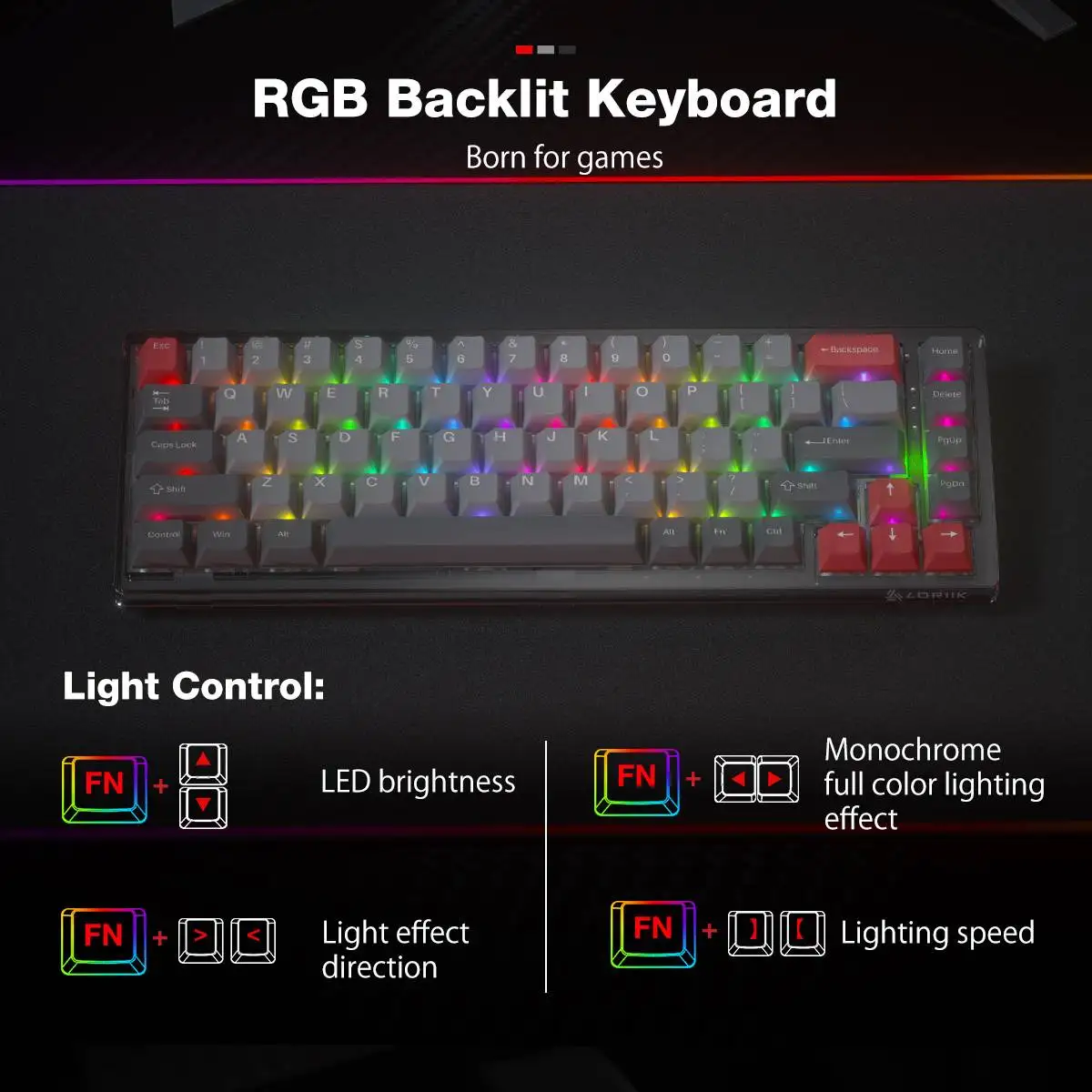 LORIIK LR68 mechanical keyboard comes with a multi-color RGB backlight that supports different lighting effects.