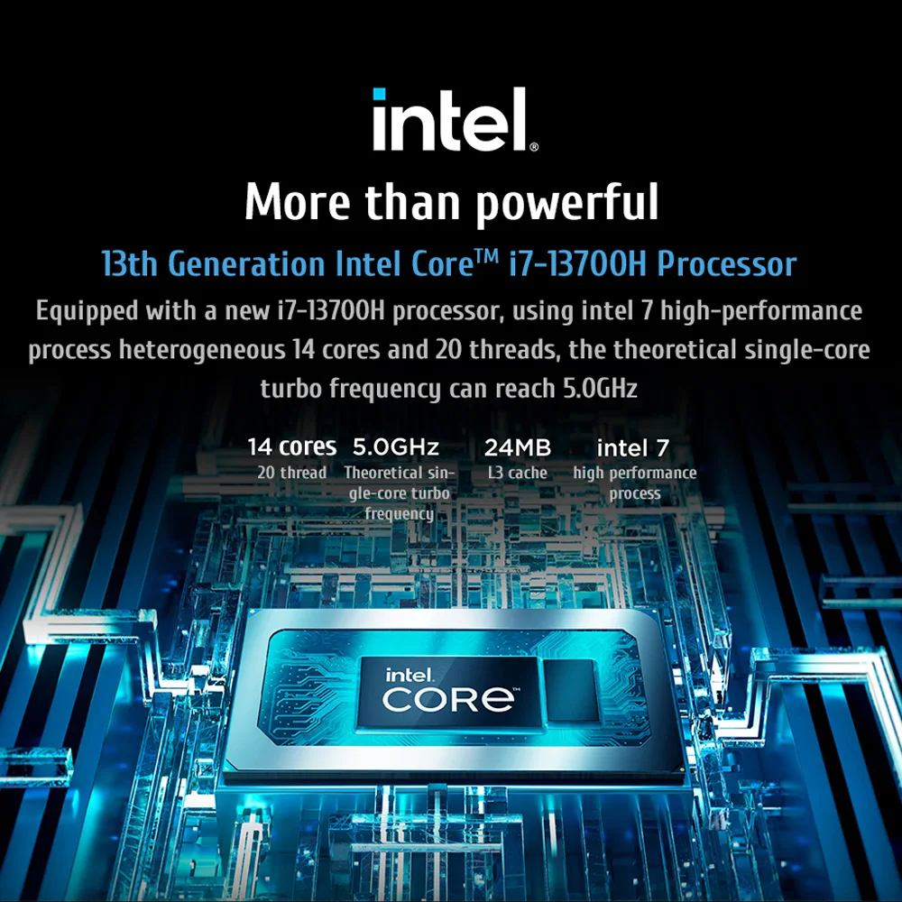 Equipped with a new i7-13700H processor, using intel 7 high-performance process heterogeneous 14 cores and 20 threads, the theoretical single-core turbo frequency can reach 5.0GHz