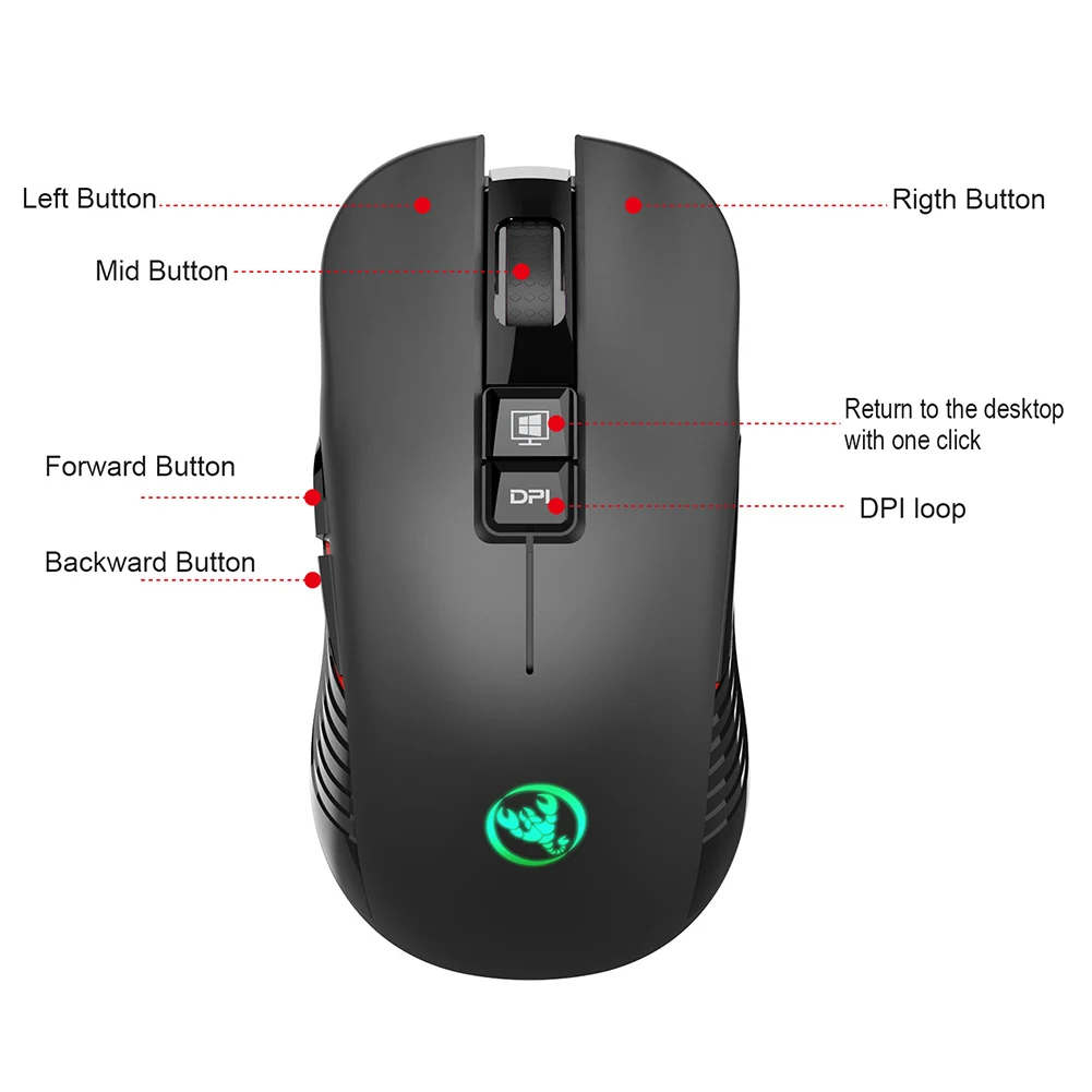 The new ergonomic wireless gaming mouse, quiet design, gives you a quiet game or office experience. Using high-end 2.4G wireless IC with no interference. 1600 default dpi, and can be adjusted up to 3600dpi. Color lighting design, bottom red button allows you to quickly turn off the lights. Designed to make your operation more convenient. One-click return to desktop design improves office efficiency. Rechargeable design, using 750 mAh large capacity battery, it can be used permanently without replacing the battery, support normal use when charging. Features: